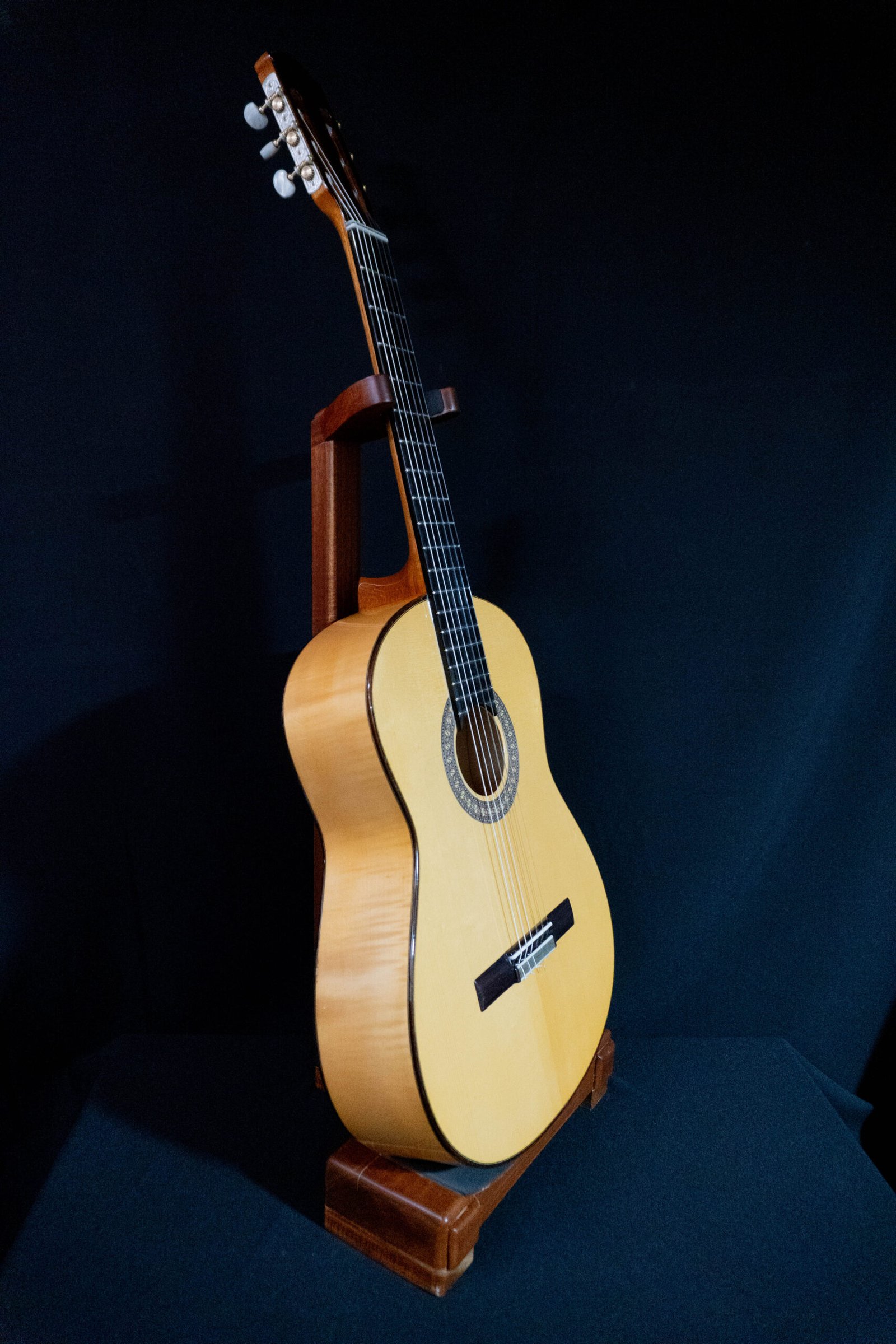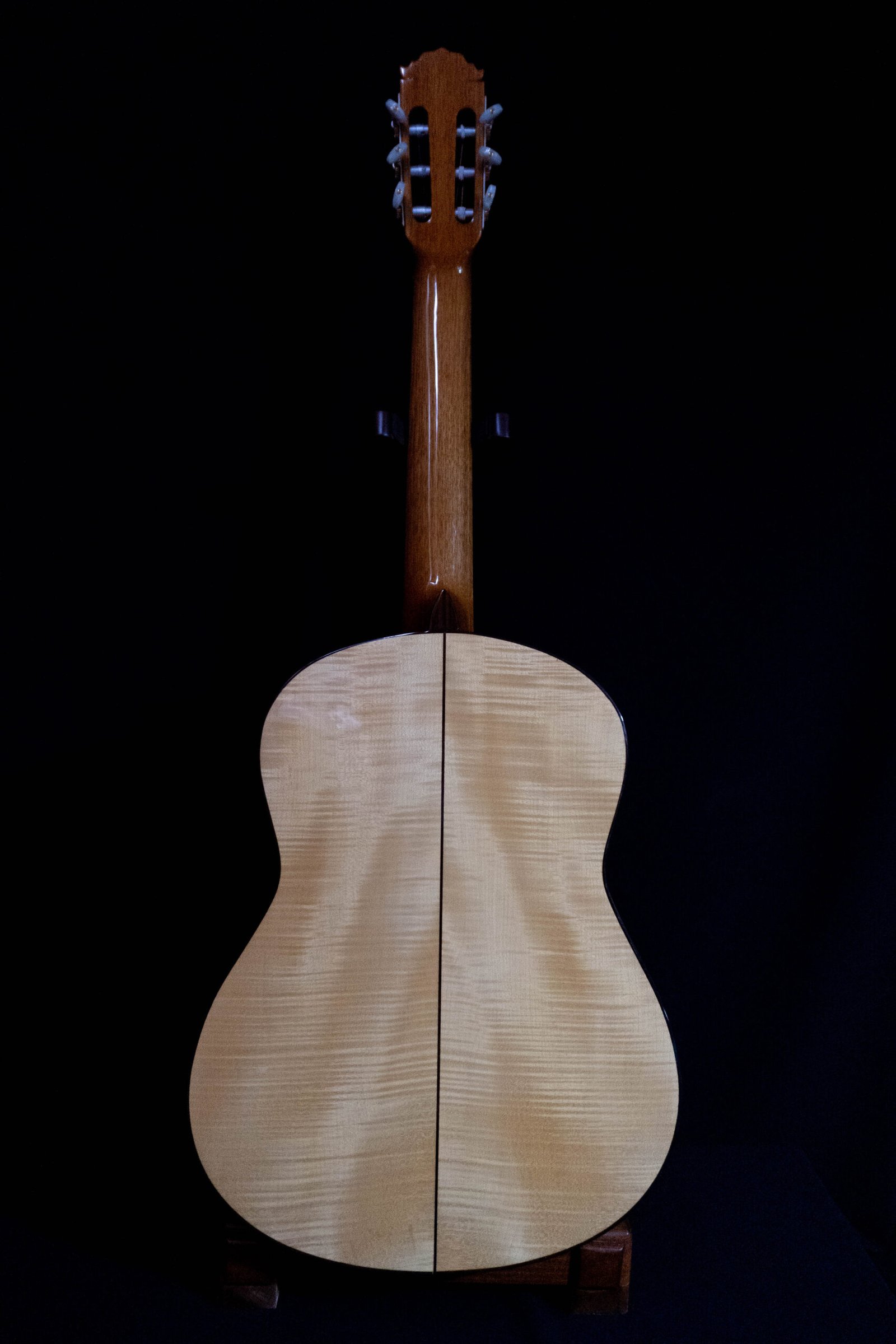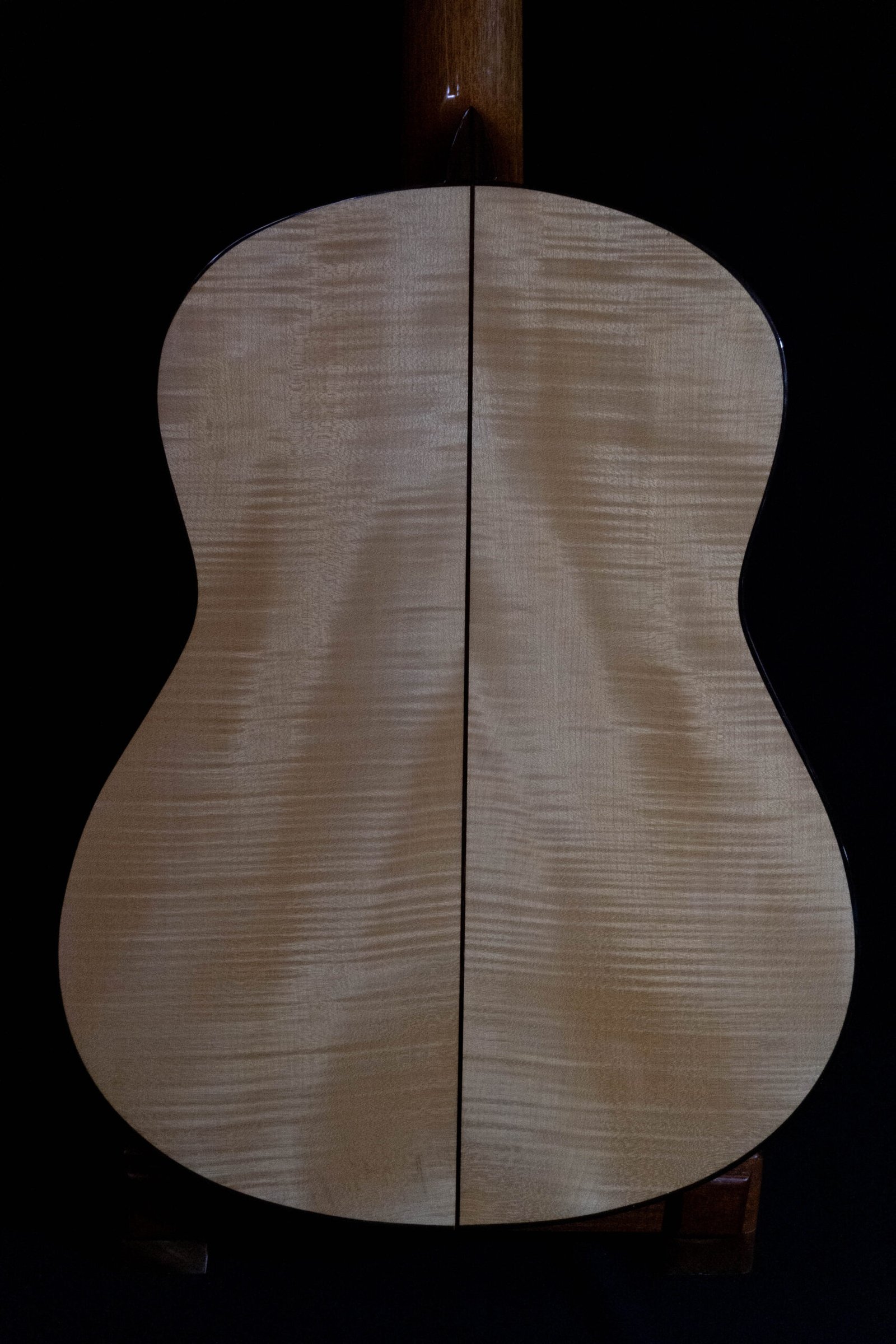 Tapa Pino Abeto alemán, más Cuerpo Arce rizado. Mango en Cedro de Brasil, Diapasón de Ébano. Pala en Palosanto de India, perfiles en Palosanto de India, Puente en Palosanto de India, huesos naturales y Clavijeros mecánicos