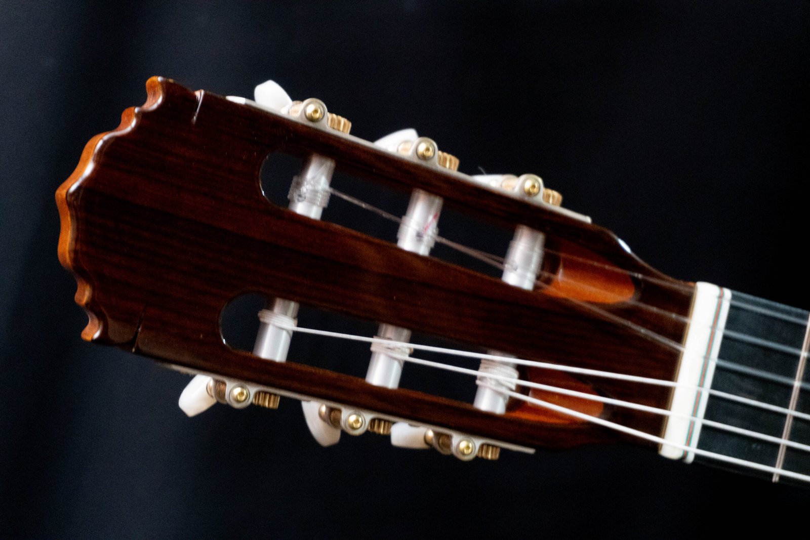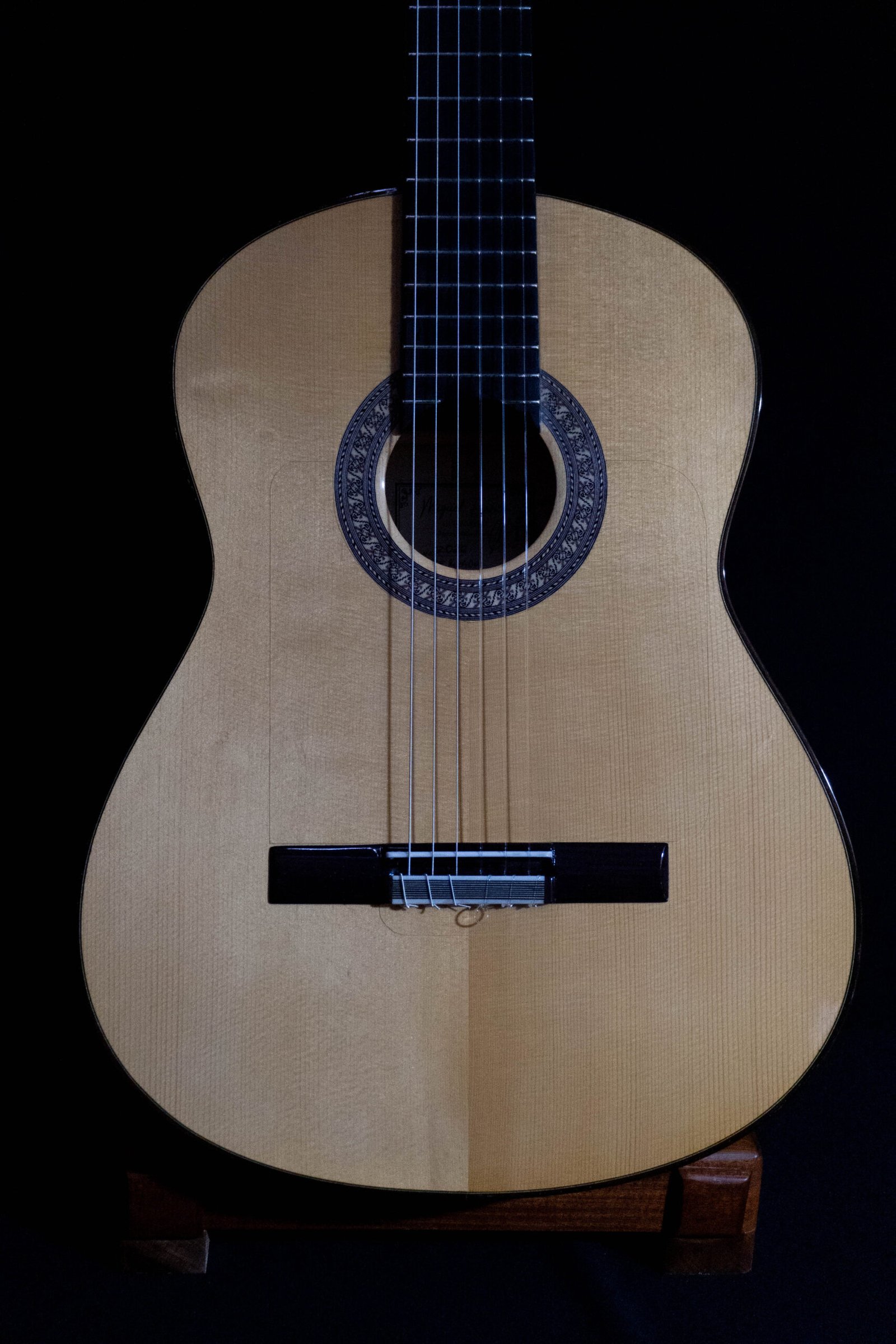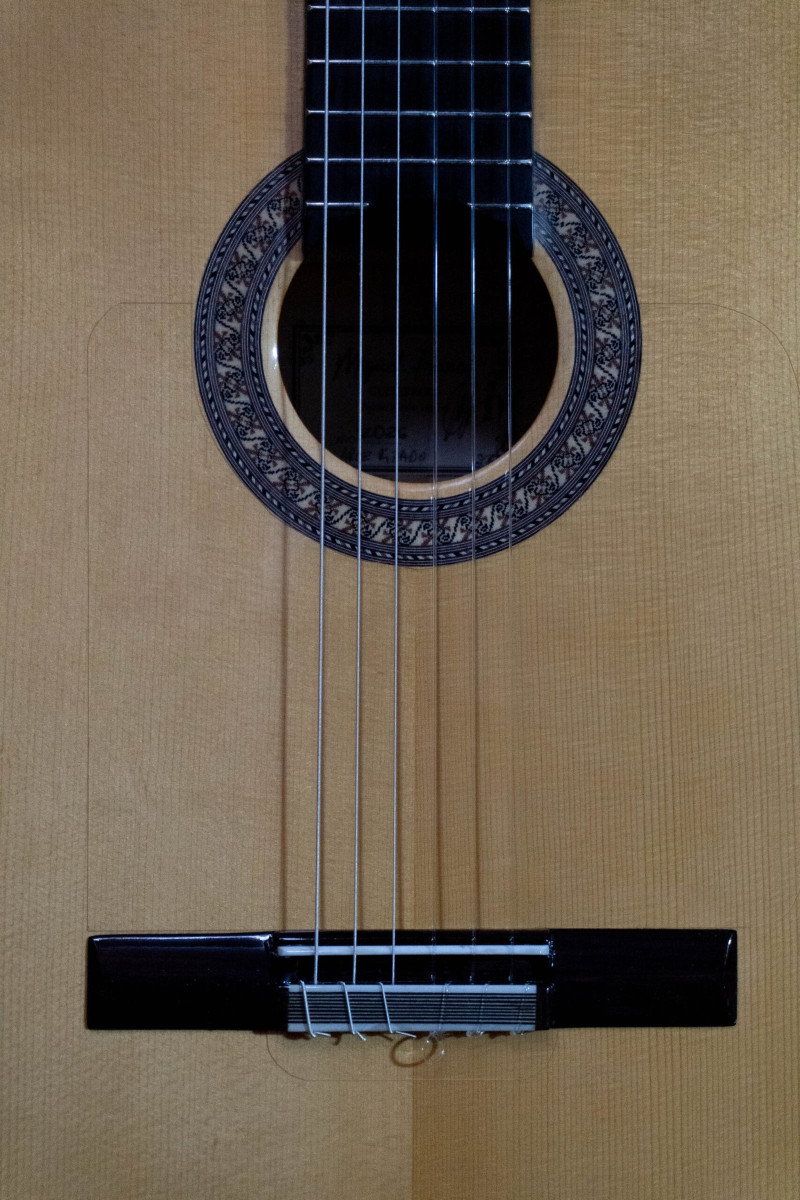 Tapa Pino Abeto alemán, más Cuerpo Arce rizado. Mango en Cedro de Brasil, Diapasón de Ébano. Pala en Palosanto de India, perfiles en Palosanto de India, Puente en Palosanto de India, huesos naturales y Clavijeros mecánicos