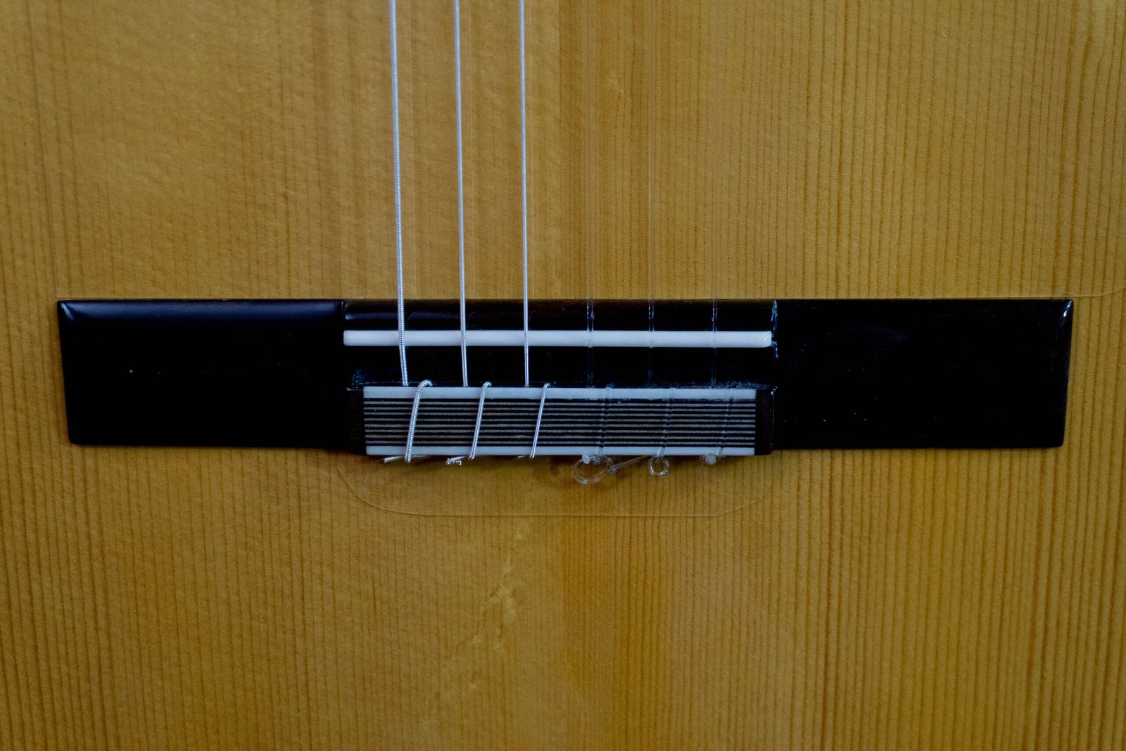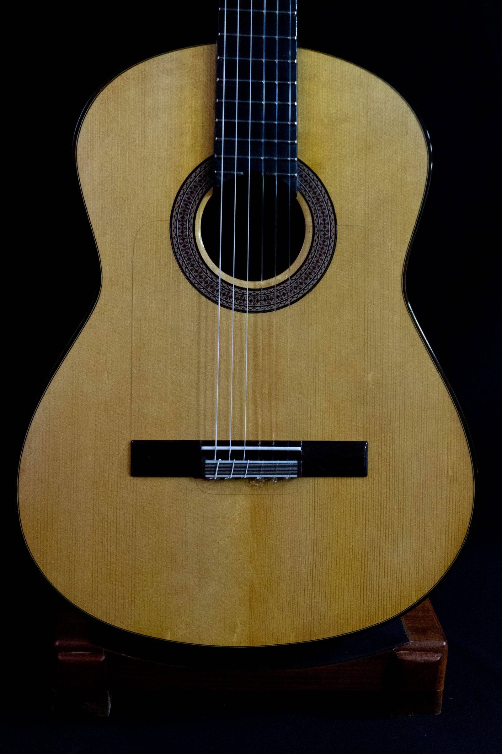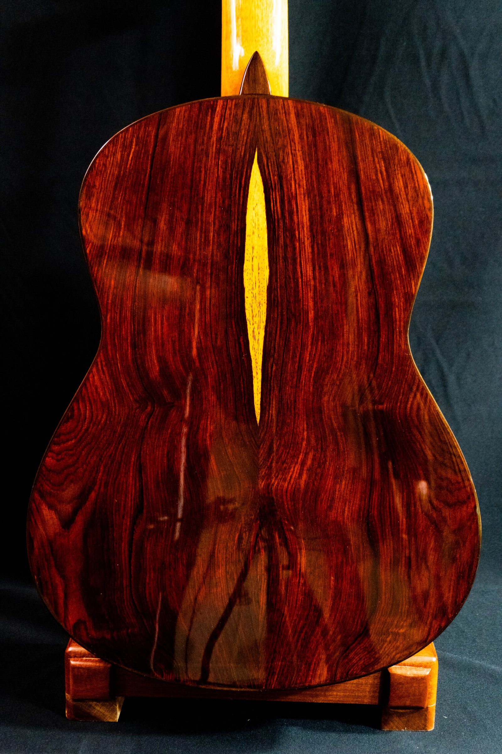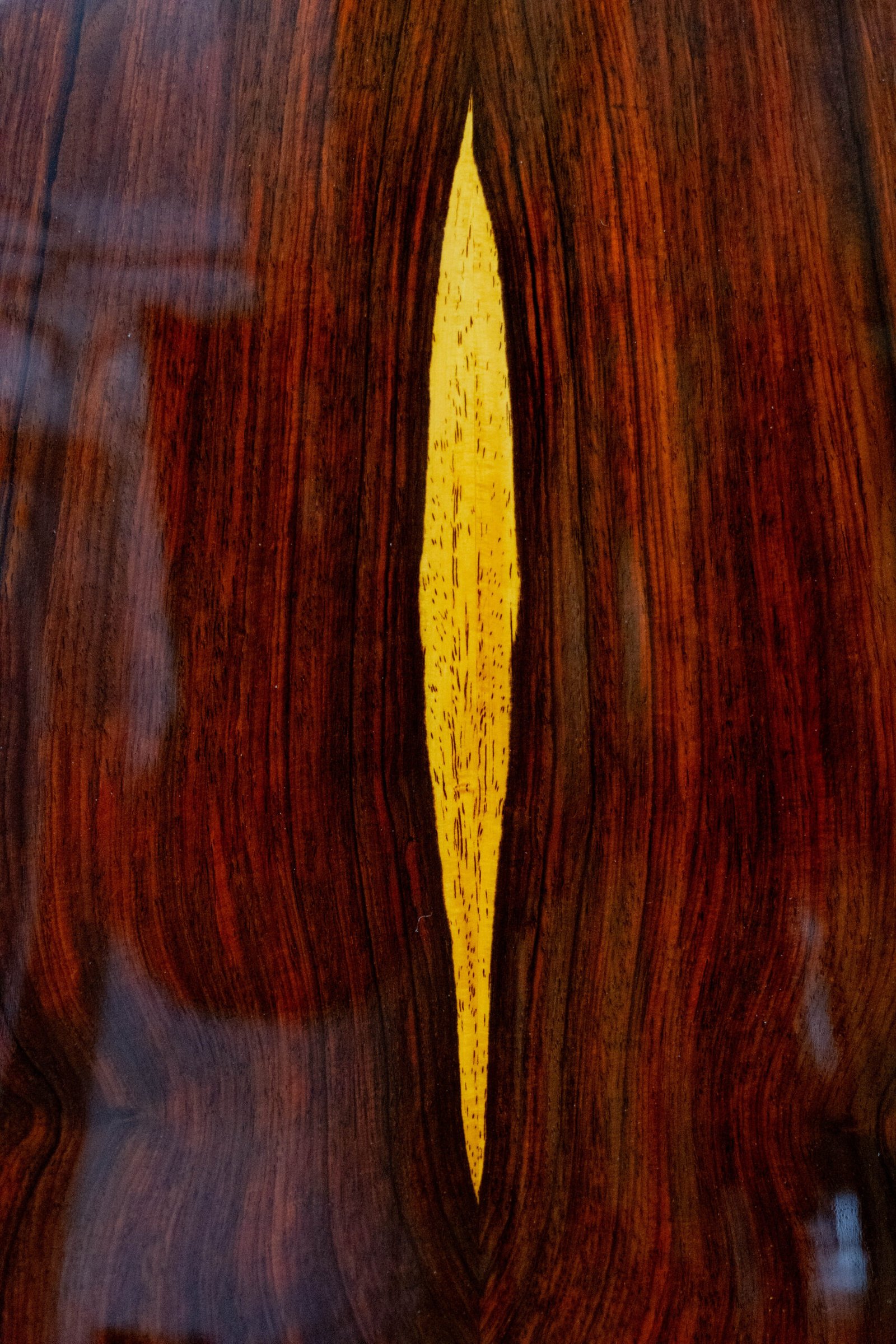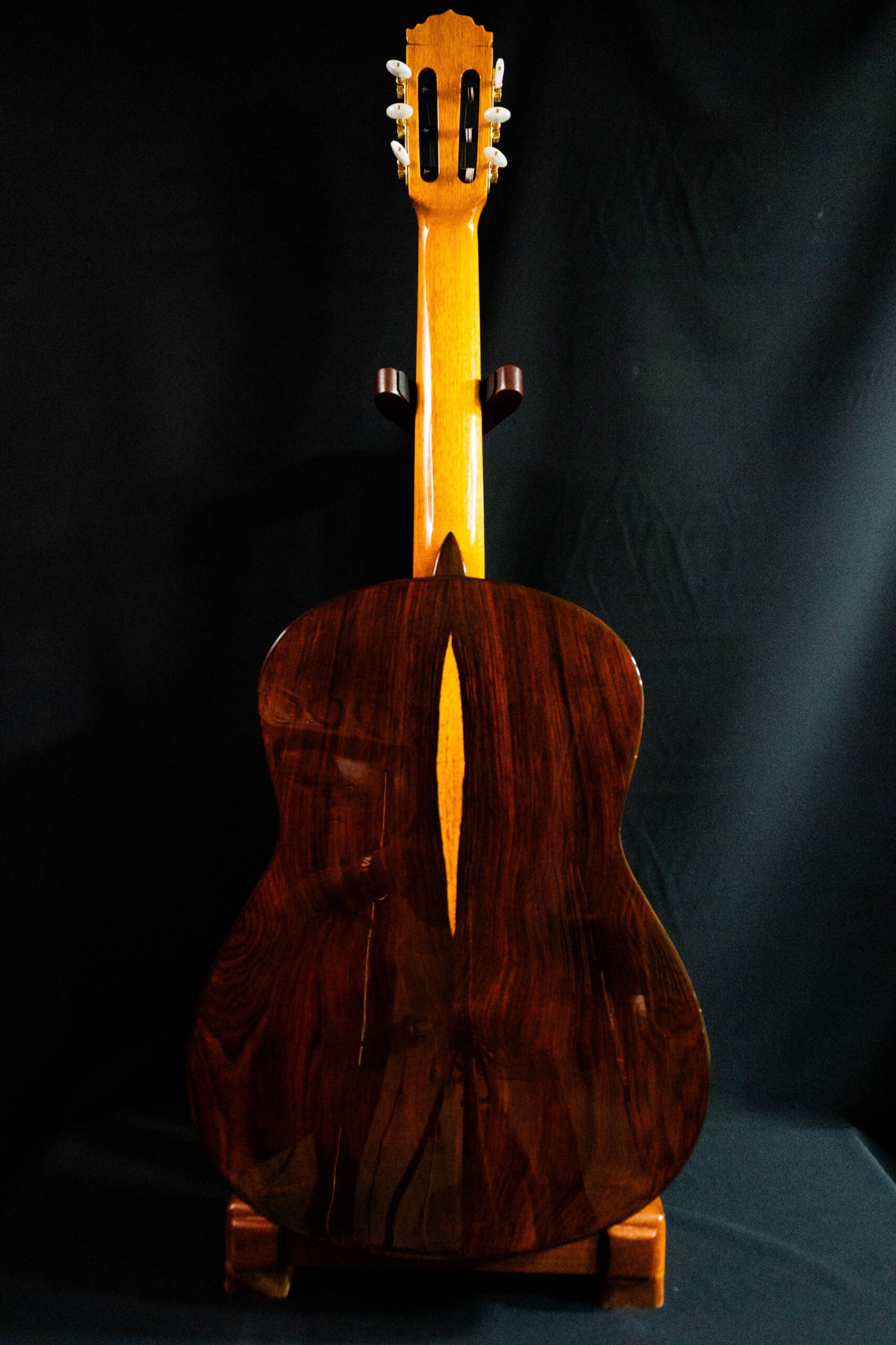 Tapa de Pino Abeto alemán. Cuerpo de Cococbolo, Mango Cedro de Brazil, Diapasón de Ébano. Pala de Palosanto de India, perfiles en Palosanto de India, Puente en Palosanto de India, Huesos naturales, clavijeros mecánicos